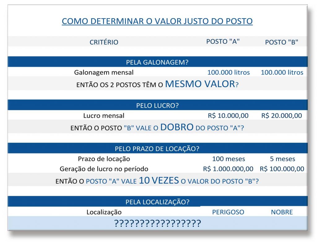Analisando-se o quadro, fica óbvio que o valor de um posto não pode ser determinado apenas pela galonagem, pelo lucro, pelo prazo de locação, localização, etc.